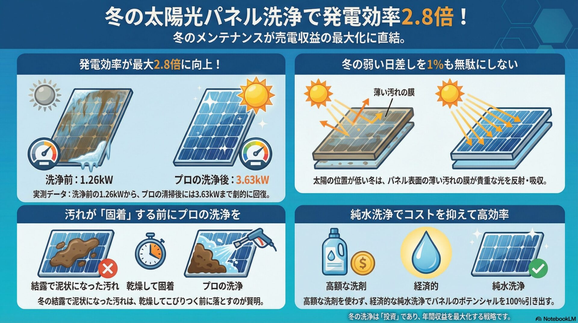 実は、日照時間が短い冬こそ、パネルの汚れが収益に致命的なダメージを与えています。